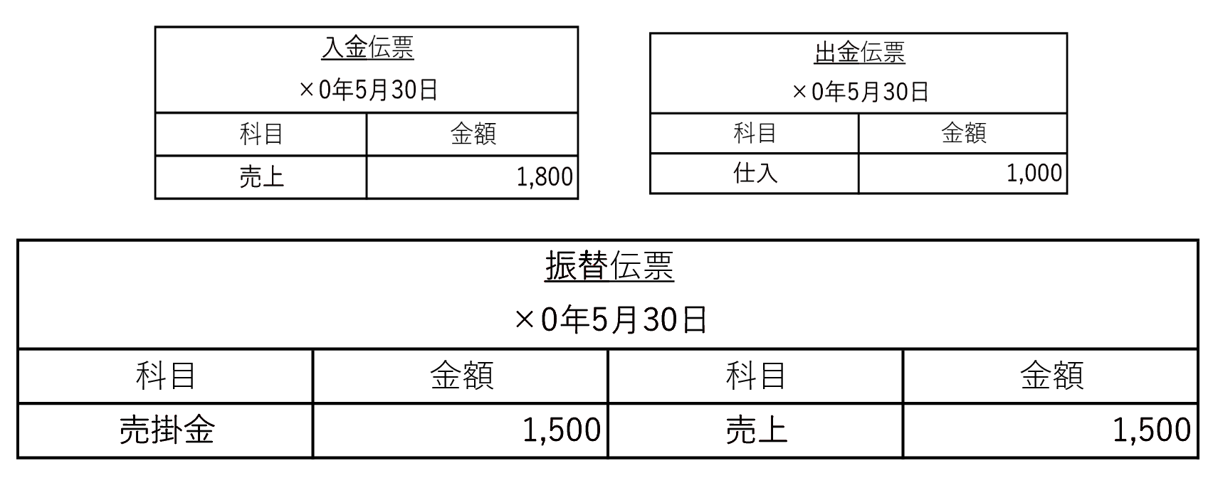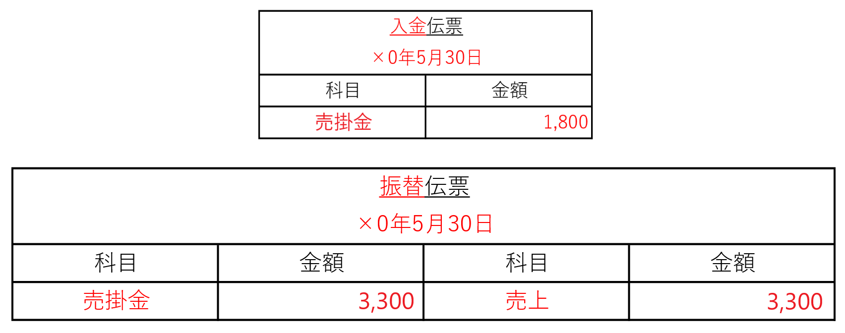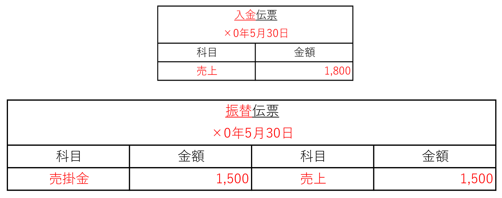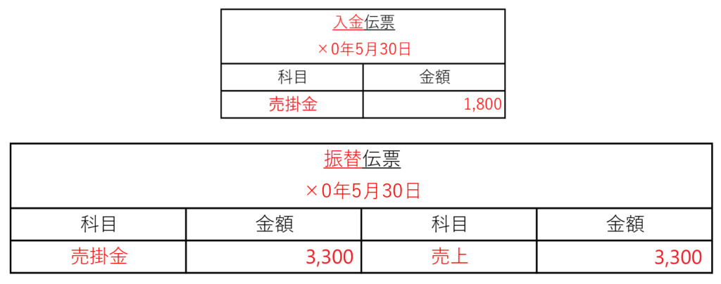 ×0年5月30日,三伝票制を採用する場合において,商品3,300円を売上げ,うち1,800円を現金で,残額を掛けとした。