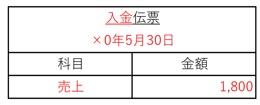 ×0年5月30日,三伝票制を採用する場合において,商品1,800円を売上げ,代金は現金で受け取った。
