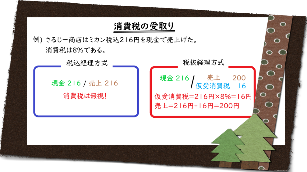 また,ミカン200円を売り上げるときに消費税16円を上乗せした216円を受け取った。