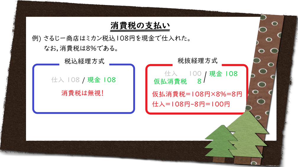 さるじー商店では,ミカン100円を仕入れるときに消費税8円を上乗せした108円を支払った。